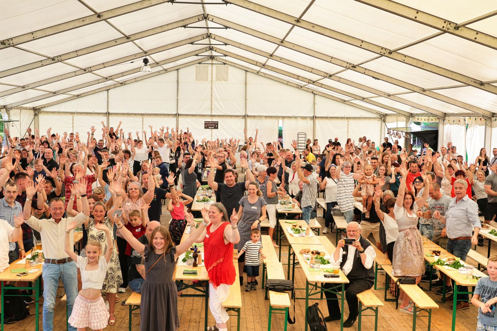 • Auf diesem Bild ist eine Großaufnahme von den Besuchern des Festes zu sehen. Viele strecken dabei die Hände freudig in die Luft.