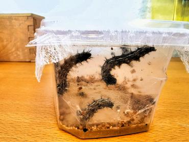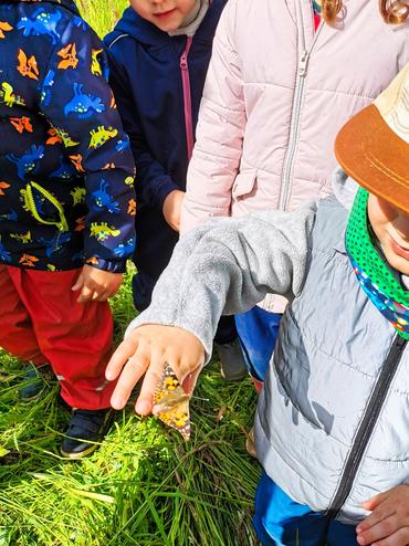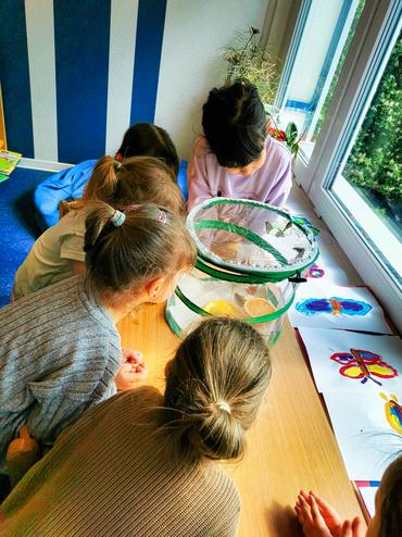 Gemeinsam begleiteten die Kinder 7 Distelfalter-Raupen auf ihrem Weg zur Verwandlung – vom winzigen Raupenbaby bis hin zum wunderschönen Schmetterling. Täglich wurde beobachtet, gestaunt und gehofft: Hat sich schon jemand verpuppt?