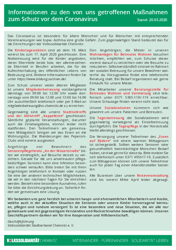 Das Coronavirus ist besonders für ältere Menschen und für Menschen mit entsprechenden Vorerkrankungen wie bspw. Asthma eine große Gefahr. Zum gegenwärtigen Stand bedeutet das für die Einrichtungen der Volkssolidarität Chemnitz:
