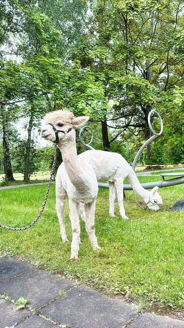 Und dann – fast schon versteckt im hinteren Teil des Gartens – wartete unser größtes Staunen: vier flauschige Alpakas aus dem Chemnitztal!