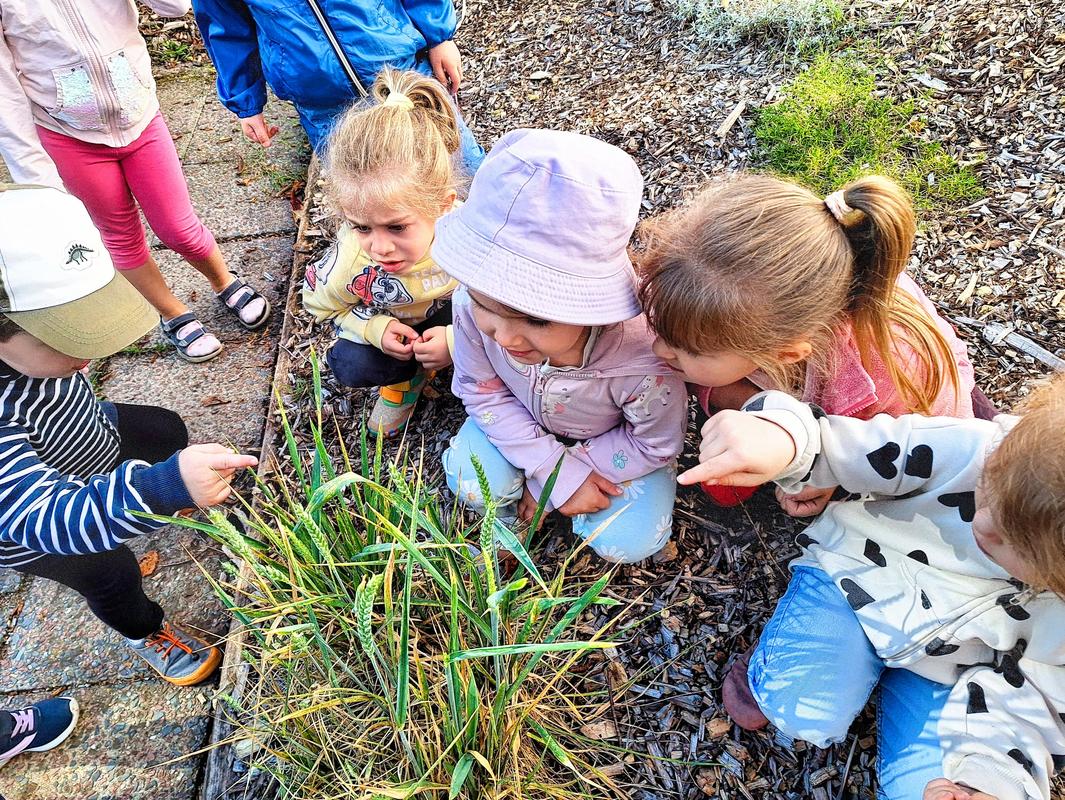 Nachdem die Kinder ihren Weizen nicht wegwerfen wollten und ihn im Garten einpflanzten, entdeckten sie im Sommer voller Staunen echte grüne Ähren. Das war der Start für viele spannende Entdeckungen rund um Getreide und Brot.