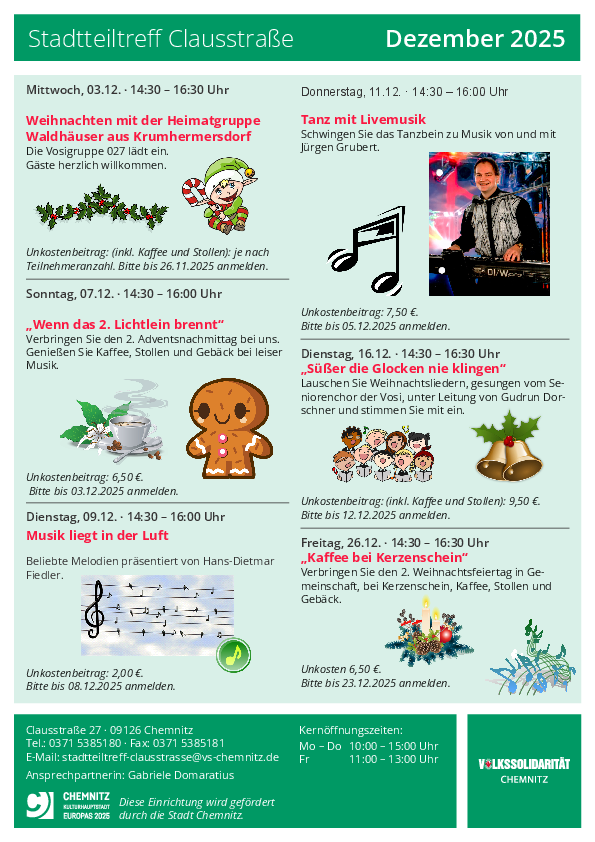Lauschen Sie Weihnachtsliedern, gesungen vom Se-niorenchor der Vosi, unter Leitung von Gudrun Dorschner und stimmen Sie mit ein.
