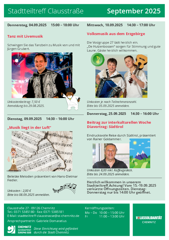 Am Rande des flächenmäßig kleinsten Stadtteils von Chemnitz, dem Lutherviertel, liegt der Stadtteiltreff zentral auf der Clausstraße. Im Gebäude, eine Wohnanlage für Betreutes Wohnen, befinden sich unter anderem auch eine Sozialstation und die Beratungsstelle für Wohnen und Vermietung der Volkssolidarität. Mit Bus und Bahn ist der Stadtteiltreff in nur wenigen Minuten vom Stadtzentrum aus zu erreichen.